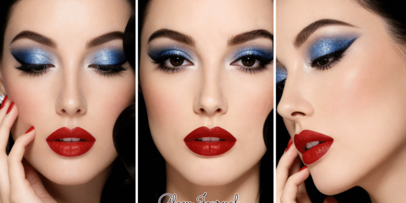 Starry Blue Glitter & Red Lip Makeup: Retro Contrast for Gala Center Stage